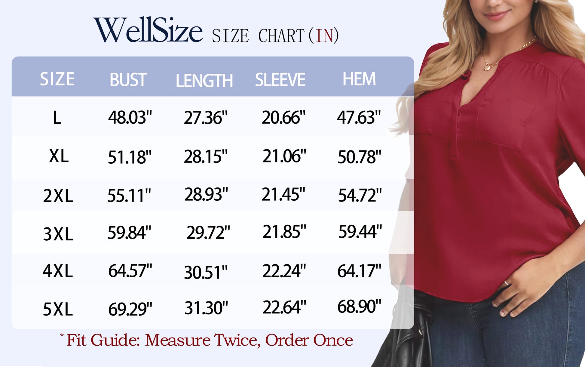 WellSize 3/4 Roll Sleeve Work Shirts for Women Plus Size Tunic Tops Flowy V Neck Button Down Blouses with Pockets